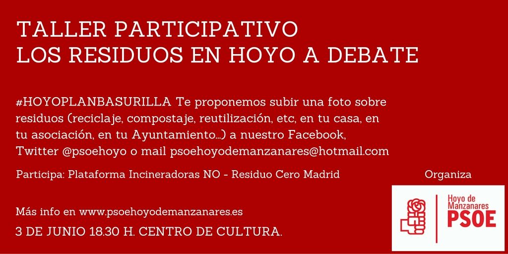El próximo 3 de junio a las 18.30 hemos organizado desde el PSOE Hoyo de Manzanares un taller participativo “Los residuos en Hoyo a debate” en el que participará la Plataforma Incineradoras No – Residuo Cero Madrid en el Centro de Cultura en la Plaza Cervantes.